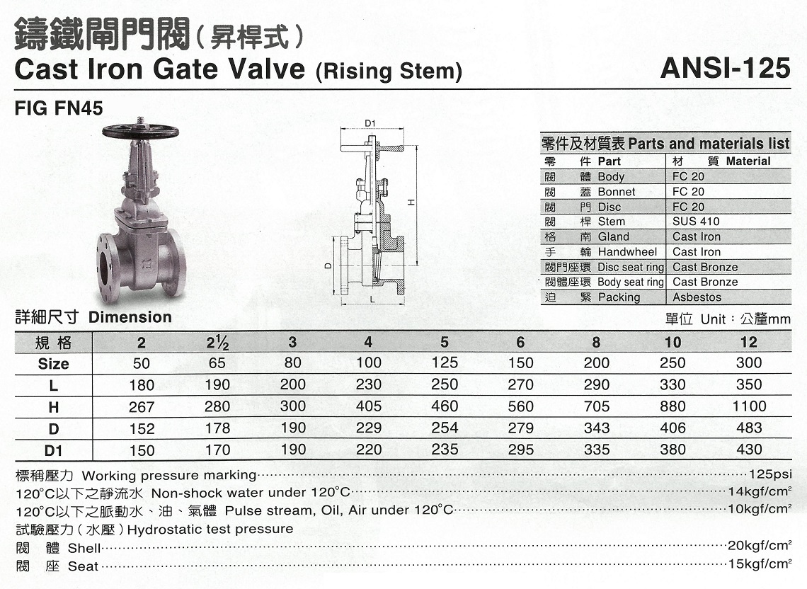 FN45 鑄鐵閘門閥(昇桿式) ANSI-125