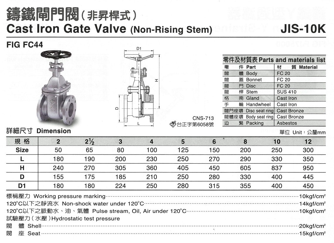 FC44 鑄鐵閘門閥(非昇桿式) JIS-10K